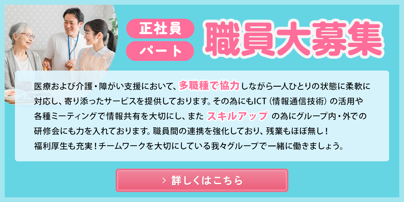 | スタッフ募集のお知らせ ただ今、介護福祉士・介護スタッフ、正・准看護師、医療事務を募集しております。 詳しくはスタッフ募集ページをご覧ください。 |